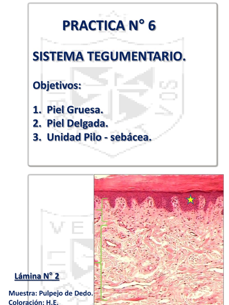 Tu piel tiende a volverse más delgada con la edad. Es resistente y elástica para amoldarse a las formas y a la estructura del cuerpo. La piel gruesa está ubicada en las zonas de mayor fricción donde se necesita que haya un grosor suficiente para soportar las fuerzas externas y la piel no se ulcere. Piel delgada La piel delgada cubre todo el cuerpo menos las palmas de las manos y las plantas de los pies y contiene menos glándulas sudoríparas que la piel gruesa. Por es las plantas y palmas tienen piel gruesa. Objetivos Que al terminar la práctica virtual seas capaz de Reconocer la estructura general de la piel Distinguir entre un corte de piel gruesa y piel delgada así como reconocer sus diferencias Reconocer y describir los anexos de la piel. E sta sección de piel gruesa procede de la palma de la mano de una rata.